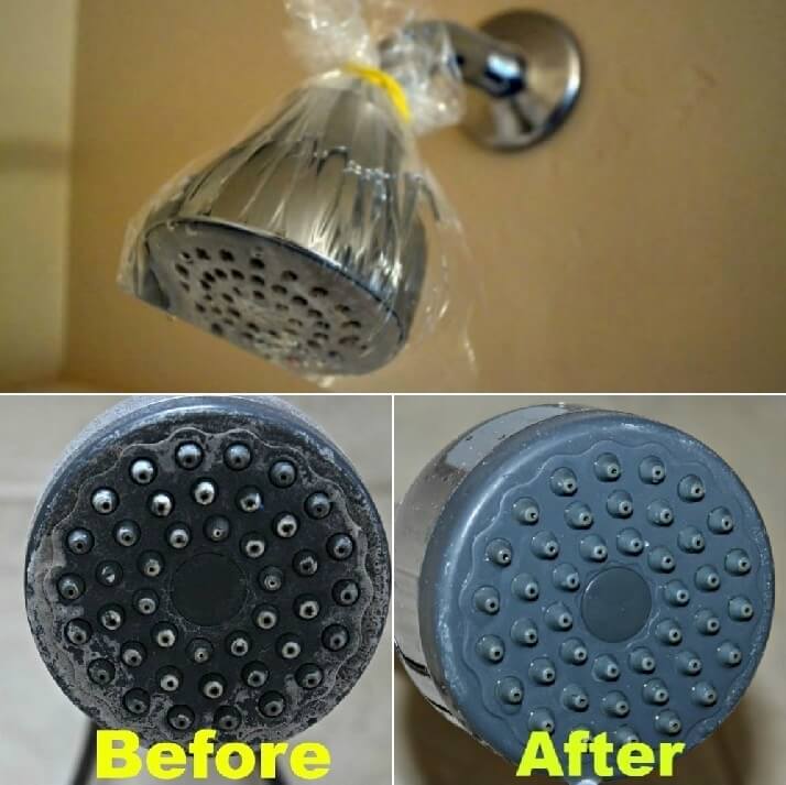 Simply take a plastic bag and a bottle of vinegar, fill the plastic bag halfway with vinegar, secure it around your showerhead, and leave it overnight. In the morning, you can take it off, and you’ll see a significant improvement in the water flow.