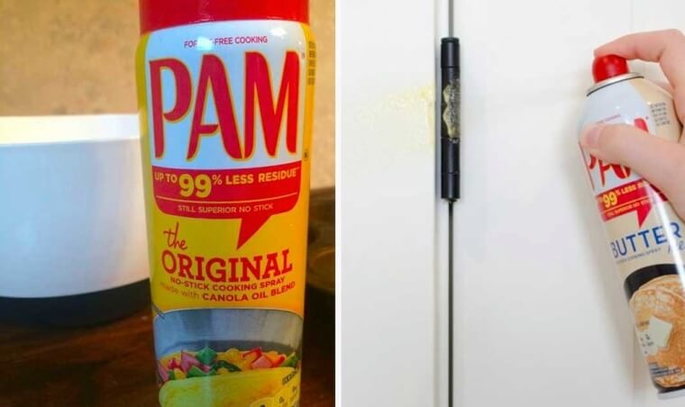 You’ll need some cooking spray, which you likely already have at home. Simply grab the can and spray it on the hinges of the squeaky items. The noise will stop almost immediately, and you can use everything without any issue.