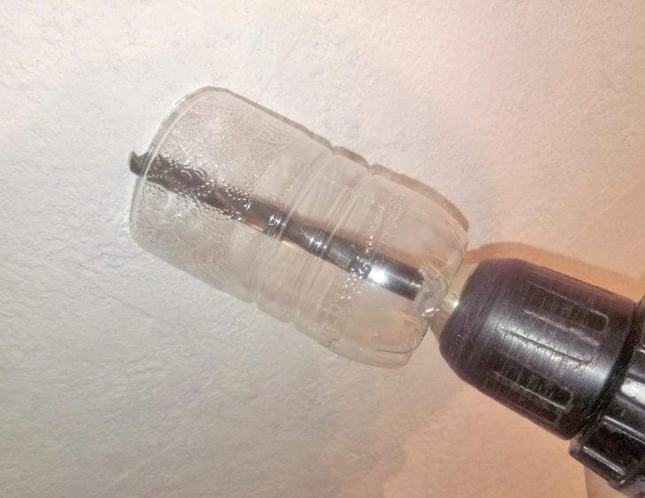 Simply take a plastic bottle, cut off the top portion, and attach it to the drill. This way, any debris created while drilling will be caught by the plastic bottle, saving you from spending hours cleaning up later.