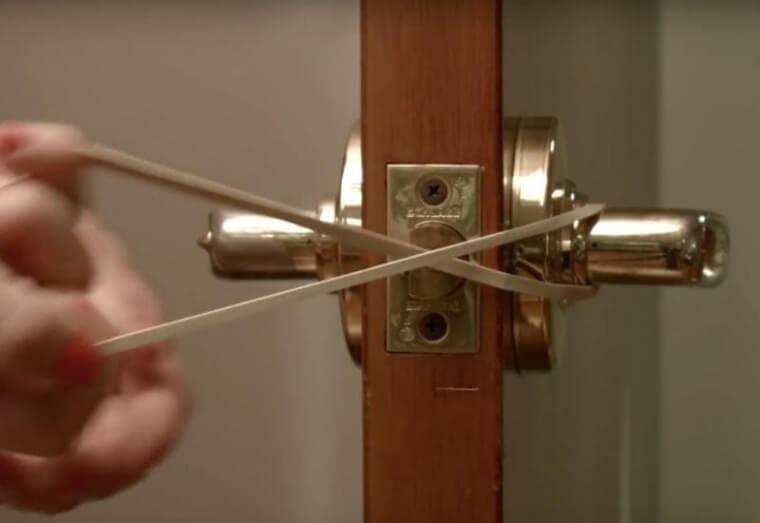 To make this work, you’ll need a thick rubber band instead of the usual thin ones. First, keep the door open and loop the rubber band around the door handle on one side. Then, stretch the rubber band to reach the handle on the other side, using the same looping method. Once your rubber band is stretched from one side to the other, make sure that the band runs both above and below the door’s latch. This helps create a bumper effect, preventing the door from closing. If you don’t have thick rubber bands, you can use several rubber bands to achieve the same effect.