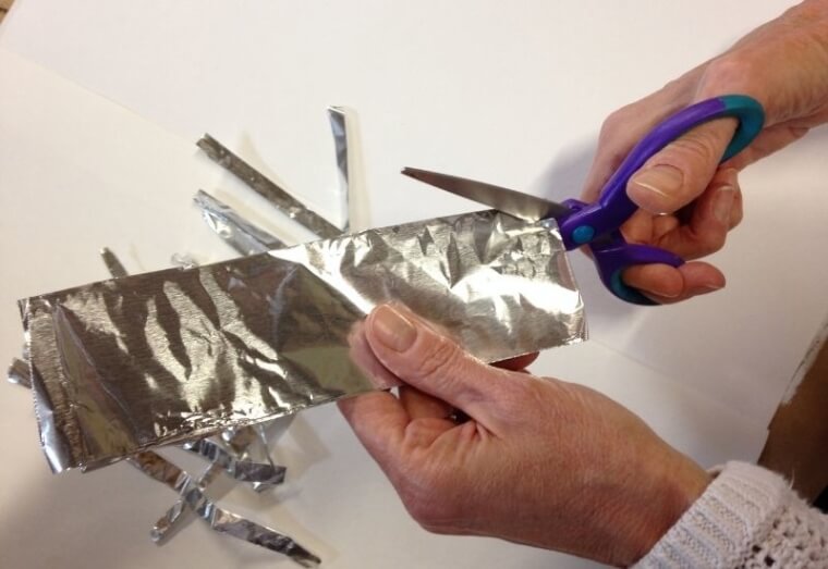 Begin by taking an 8- or 10-inch piece of aluminum foil and folding it lengthwise. Then, use scissors to cut the folded aluminum foil lengthwise as well. Ensure that you cut thin strips so you can reuse the same piece of aluminum foil multiple times. If necessary, you can use more than one piece of folded aluminum foil. Ensure that every part of the scissor blade contacts the foil by using full strokes. After completing this process, take a paper towel, dampen it with warm water, and use it to wipe the scissors clean of any debris.