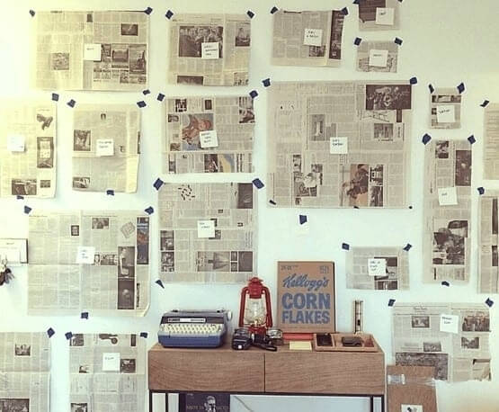 Using a newspaper, you can easily organize the design of your gallery wall and make a template to ensure you’re happy with the arrangement. Begin by placing a frame on the newspaper and outlining it with a black marker. Remove the frame, cut out the shape you traced, and label it with a number assigned to that specific frame. After repeating this process for each frame, use painter’s tape to attach the newspaper cutouts to the wall. The painter’s tape will let you remove the newspaper without harming the wall’s paint.